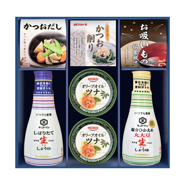キッコーマンしぼりたて生しょうゆ、塩分ひかえめ丸大豆生しょうゆ各200ml、シーラックかつおだし(4g×3)、マルトモかつおパック(0.7g×3)、永谷園お吸いもの(2.3g×2)×各1、宝幸オリーブオイルツナ70g×2