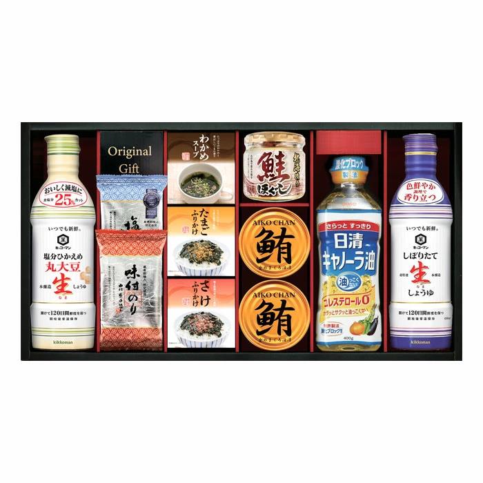 キッコーマン塩分ひかえめ丸大豆生しょうゆ、キッコーマンしぼりたて生しょうゆ各450ml、わかめスープ(3.8g×3)、丸美屋たまごふりかけ(2.5g×3)、丸美屋さけふりかけ(2.5g×3)、味付のり(8切6枚)、有明海産塩のり(8切6枚)、日清キャノーラ油400g、鮭ほぐし50g×各1、まぐろ油漬け70g×2