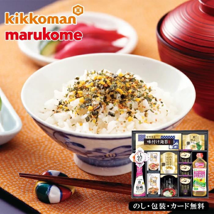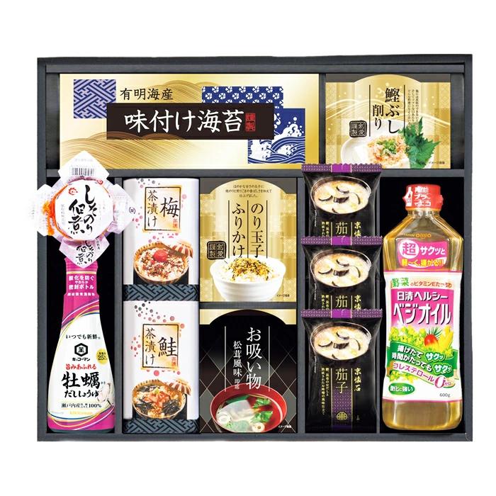 有明海産味付海苔(3切6枚)、鰹ぶし削り(2g×3袋)、島の香しそのり佃煮80g、梅茶漬け(4.3g×2袋)、鮭茶漬け(4.7g×2袋)、のり玉子ふりかけ(4.5g×2袋)、永谷園お吸いもの松茸風味(2.3g×4袋)、キッコーマン牡蠣だししょうゆ200ml、日清ヘルシーベジオイル600g×各1、マルコメ京懐石茄子のおみそ汁11.5g×3【卵、乳、小麦】