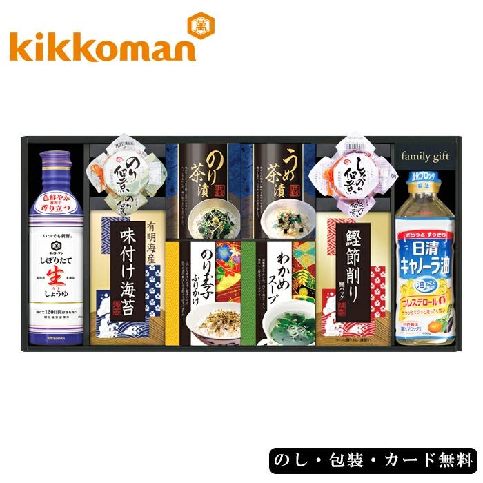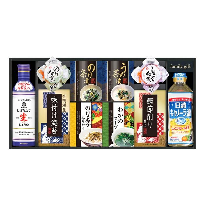 島の香のり佃煮、島の香しそのり佃煮各80g、有明海産味付け海苔(8切8枚×2袋)、のり茶漬け(4.3g×2袋)、うめ茶漬け(4.3g×2袋)、のり玉子ふりかけ(4.5g×2袋)、わかめスープ(5.3g×2袋)、鰹節削り(1.5g×4袋)、日清キャノーラ油400g、キッコーマンしぼりたて生しょうゆ450ml×各1