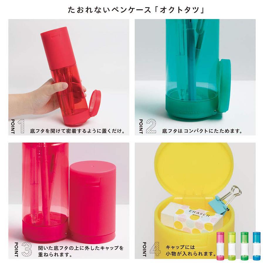使い方は簡単。底フタを開け、オクトタツが密着するように机に置くだけ。底面の吸着パッドがピタッと机に貼りつき、たったこれだけで、しっかり自立します。開けた底フタはコンパクトに畳めるほか、畳まずに、底フタの上に外したオクトタツのキャップを重ねることが出来ます。キャップには小物を入れることもでき、消しゴムなどを収納できます。本体にはペンなどの筆記用具を約15本収納可能です。