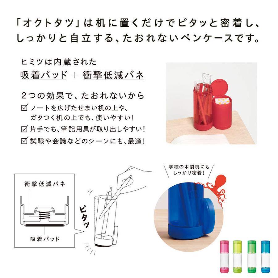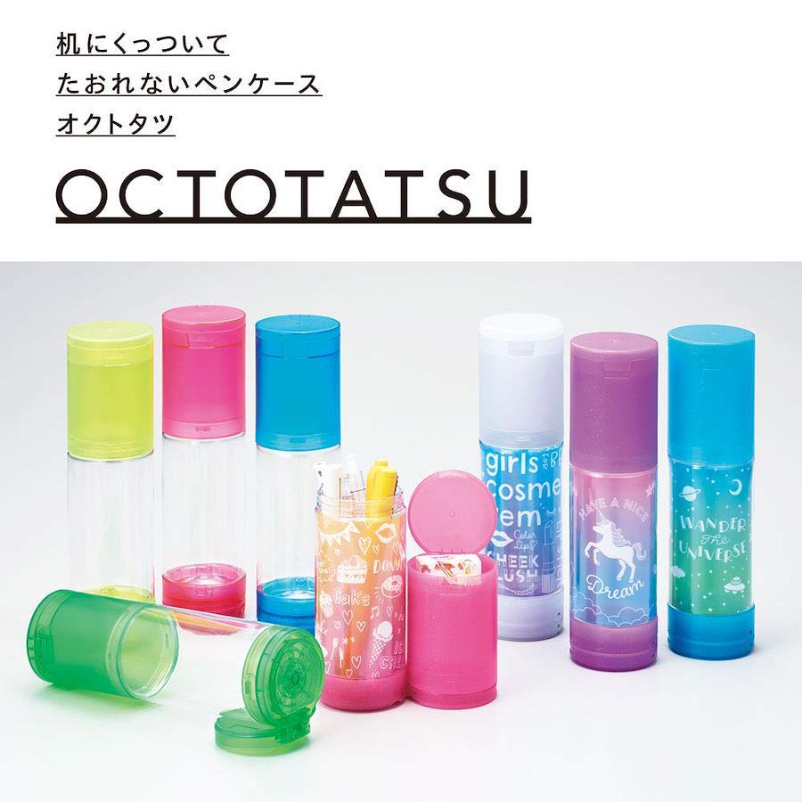 【机にピタッとくっついて倒れないペンケースにネオンカラーが登場!】「オクトタツ」は、机に置くだけでピタッと密着し自立する、倒れないペンケースです。そのヒミツは、底面に内蔵された吸着パッド+衝撃低減バネ。底面の吸着パッドが机に密着し、オクトタツ本体をしっかり自立させます。倒れないからノートを広げたせまい机の上や、ガタつく机の上でも使いやすい!机の端に置いても大丈夫。また小学校など学校の木製机にもしっかり密着します。机にピタッと密着し固定されるので、片手でも中の筆記用具が取り出しやすい仕様です。