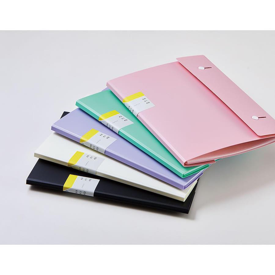 普通のクリアーファイルのようにも使える!スナップボタンを片方だけ外すことで、通常のクリア―ファイルのように書類をパラパラとめくって閲覧することができます。ファイルの表と裏を逆にすれば、裏面のポケットも同様に使用でき、楽曲や案件など内容ごとに分けてファイリングすることもできます。