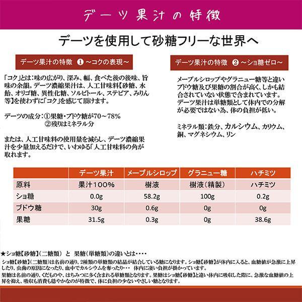 王様のデーツシロップピュアゴールドは果物、野菜、魚、肉、お菓子など様々な使い方ができる!◆デーツ果汁の特徴1〜コクの表現〜「コク」とは:味の広がり、深み、幅、食べた後の後味、旨味の余韻。デーツ濃縮果汁は、人工甘味料【砂糖、水飴、オリゴ糖、異性化糖、ソルビトール、ステビア、みりん等】を使わずに「コク」を感じて頂けます。デーツの成分:1.果糖・ブドウ糖が70~78%2.残りはミネラル分または、人工甘味料の使用量を減らし、デーツ濃縮果汁を少量加えるだけで、いわゆる人工甘味料の角が取れます。◆デーツ果汁の特徴1〜ショ糖ゼロ〜メープルシロップやグラニュー糖等と違いブドウ糖及び果糖の割合が高く、しかも結合されていない状態で含まれています。デーツ果汁は単糖類として体内での分解が必要ではない。ミネラル類:鉄分、カルシウム、カリウム、銅、マグネシウム、リン※ショ糖【砂糖】(二糖類)と果糖(単糖類)の違いとは・・・・ショ糖【砂糖】(二糖類)は名前の通り、2種類の単糖類の結晶が結合している糖になります。ショ糖【砂糖】が体内に入ると、血糖値が急激に上昇したり、虫歯の原因になったり、血中でカルシウムを奪ったり・・・。果糖は名前の通り、くだものや、はちみつに多く含まれる単糖類となります。◆デーツとは木に実をつけたまま自然乾燥する、いわば天然のドライフルーツ。干し柿のようなねっとりした食感、黒糖のようなコクの甘味は自然のキャンディと呼ばれるほど。食物繊維はバナナの7倍、鉄分はブルーベリーの3倍、カリウムはプルーンの1.8倍と、栄養がとても高いドライフルーツです。近年では、栄養と甘みがギュッと詰まったスーパーフードとして、日本でも美容と健康を意識する女性を中心に大変注目されており、砂糖の代用品として、ビーガンのデザートとして愛されています。・クレオパトラも愛した「神の与えた食物」といわれるワケドライフルーツの中で高いポリフェノール濃度!・甘みが強いのにカロリー控えめで低GI。カリウムはバナナの1.8倍!・ごぼうの約1.4倍の食物繊維!中でも不溶性食物繊維が豊富。・素早くエネルギー補給デーツに含まれる糖質の多くは単糖類(ブドウ糖・果糖)。脳と体にすばやくエネルギーを与えます。◆ゆっくり時間をかけて樹上乾燥させたデーツ(ナツメヤシの実)気温50度以上の灼熱の厳しい環境で世界有数のセヤーデーツを栽培しています。厳しい環境で育まれたデーツは強い生命力を保持し、植物のストレス応対により実の中に栄養を蓄え、高まるといわれています。熟したデーツは枝になったまま、たっぷりと太陽を浴び自然に乾燥します。収穫のプロが樹に登り、昔ながらの伝統的な方法で丁寧に手間をかけて収穫しています。■商品名:王様のデーツシロップピュアゴールド瓶ナツメヤシポリフェノールダイエットヴィーガン低GI果糖砂糖代替■内容量:400g×3個セット■原材料名:デーツ(なつめやし)■メーカー或いは販売者:日興フーズ株式会社■賞味期限:パッケージに記載■保存方法:高温多湿を避け、冷暗所に保存■区分:食品■製造国:イラン