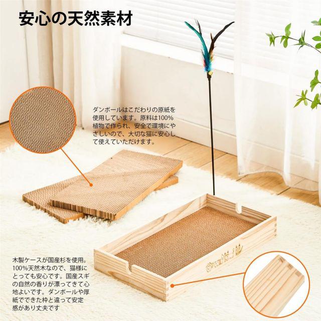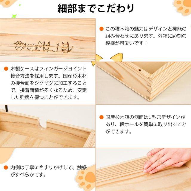 【100%天然素材】この猫爪研ぎの外枠が国産杉でできたケースです。ダンボールや厚紙でできた枠と違って安定感があり丈夫です。スギの香りが漂ってきて心地よいです。100%天然木なので、猫様にとっても安心です。つめとぎ部分に使用しているダンボールは猫ちゃんにとって無毒な紙で出来ており、原料は100%植物を使用しています。この猫つめとぎすべての素材は環境にも優しく、リサイクル可能です。