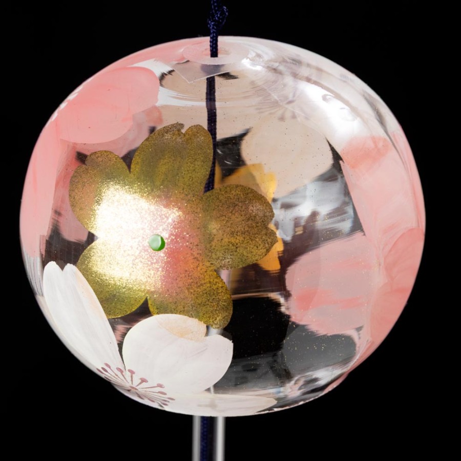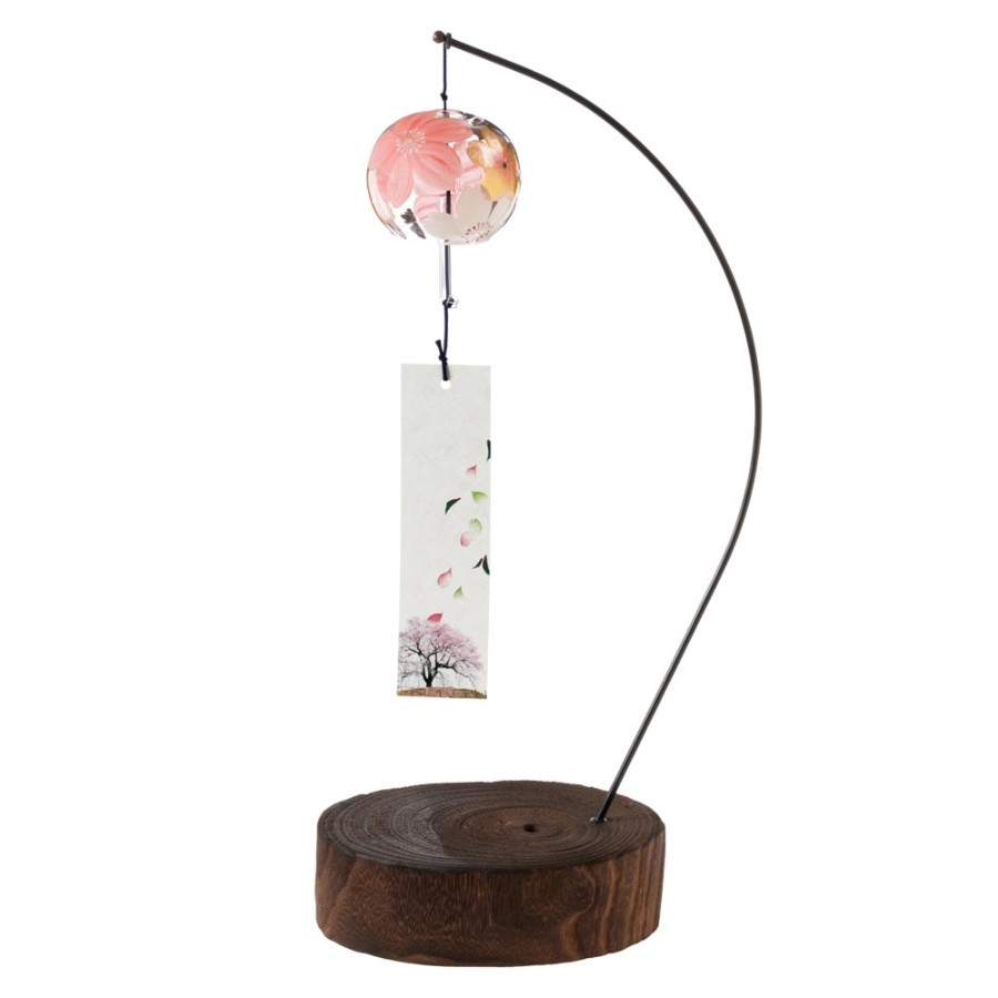 クリスタルガラスを使用した、ぬくもりのある透明感が特徴の風鈴に、その透明感を生かした柄を内側にさりげなく描いた、立体感のある柄のガラス風鈴。そこに、風鈴を吊るすスタンドをセットにしました。スタンドの台は桐材から作っていますので、木の暖かみが感じられる素朴な雰囲気が特徴です。軸は丈夫な鉄製で、安定して風鈴を吊るせます。