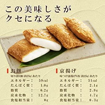 原材料:【味つけ油あげ】油あげ(大豆(アメリカ産、カナダ産)(分別生産流通管理済み)、植物油)、砂糖、醤油、還元水飴、澱粉、食塩、昆布エキス、(一部に小麦・大豆を含む)【切りもち】水稲もち米(国産)