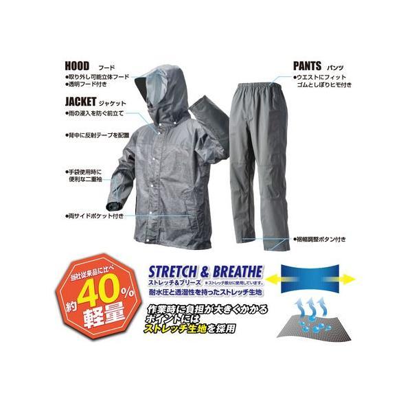 ●上着は、水の侵入を防ぐ前たて、手袋使用時に便利な2重袖、視認性の良い透明フード、左右両サイドにポケットと機能満載!