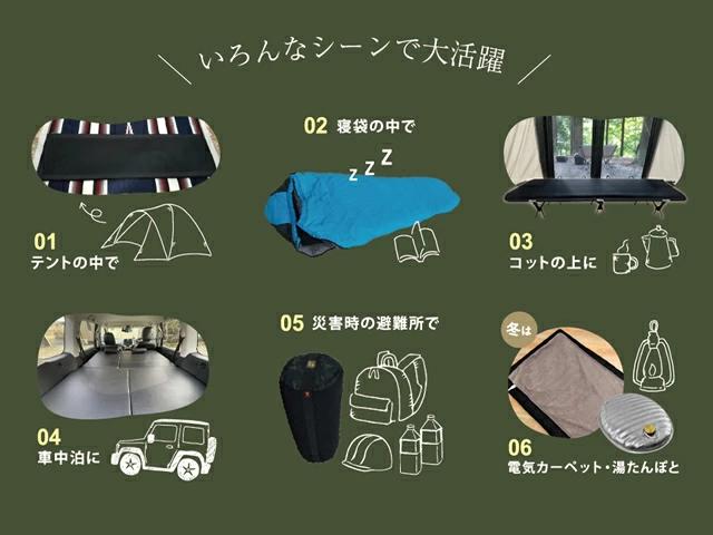 軽量で、丸めるとコンパクトになり、持ち運びや収納もしやすくレジャーにピッタリ。キャンプや車中泊だけでなく、ピクニックやスポーツ観戦、また災害時の避難所などでも活躍します。