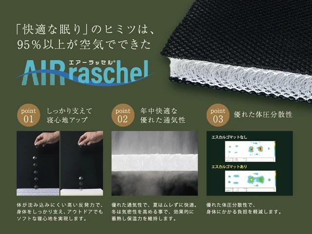 「快適な眠り」のヒミツは95%以上が空気でできた「AIR raschel」素材体の沈み込みにくい高反発力で体をしっかり支え、アウトドアでもソフトな寝心地を実現します。更に優れた体圧分散性で、身体にかかる負担を軽減します。