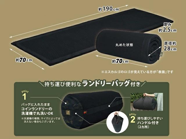 【エスカルゴマット ワイド】■サイズ:本体 約70×190×2.5cm、ランドリーバッグ 約28(直径)×80cm■本体重量:約1.9kg(ランドリーバッグ含む)■素材:側生地 ポリエステル100%(ハニカムメッシュ)、中材 ポリエステル100%(エアーラッセル)、ランドリーバッグ ポリエステル100%