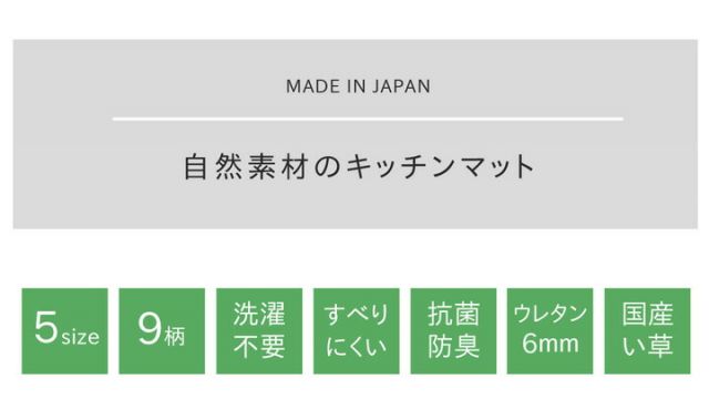 い草のキッチンマットです。キッチンマットの不満を解消してくれる商品です。化繊もののキッチンマットと比べ、汚れにくくシミになりにくいです。小さなゴミでも、ほうきで掃く、掃除機をかけるだけで取り除くことができます。い草自体が持つ油分により汚れを弾くので洗う必要がなく長くご使用いただけます。裏地には国産のウレタンフォームを使用することで,丈夫でクッション性があり滑りにくくしました。