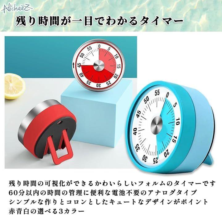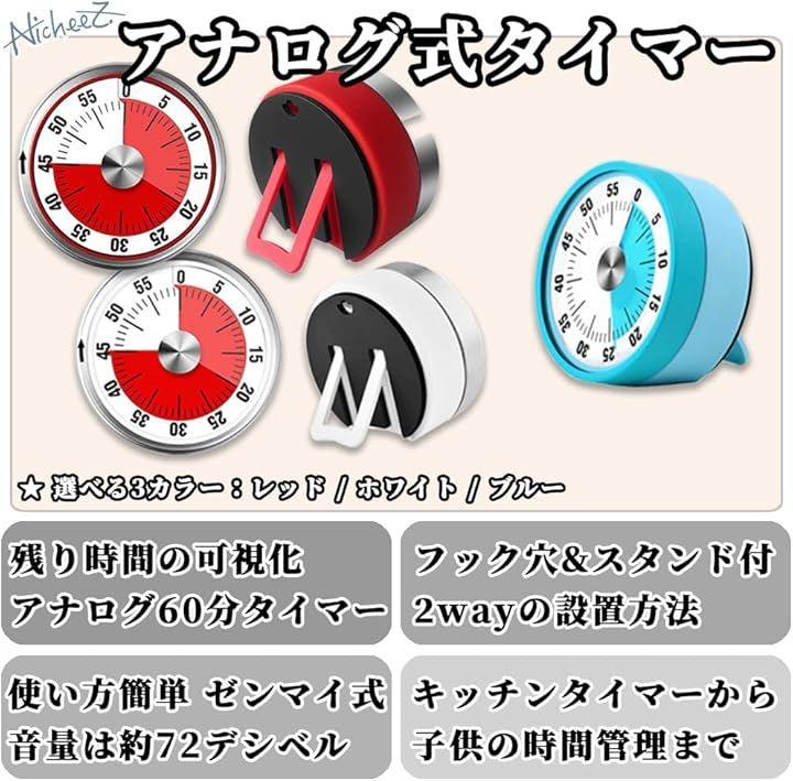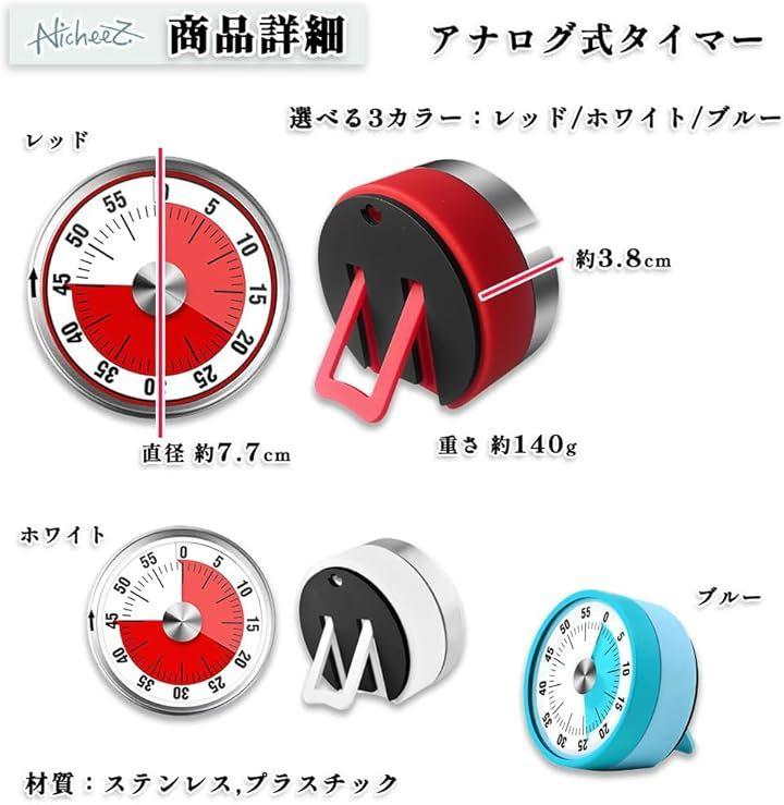 「商品内容」 アナログ式タイマー 材質:ステンレス/プラスチック カラー:レッド/ホワイト/ブルー サイズ:直径/約7.7cm 厚さ/約3.8cm 重量:約140g