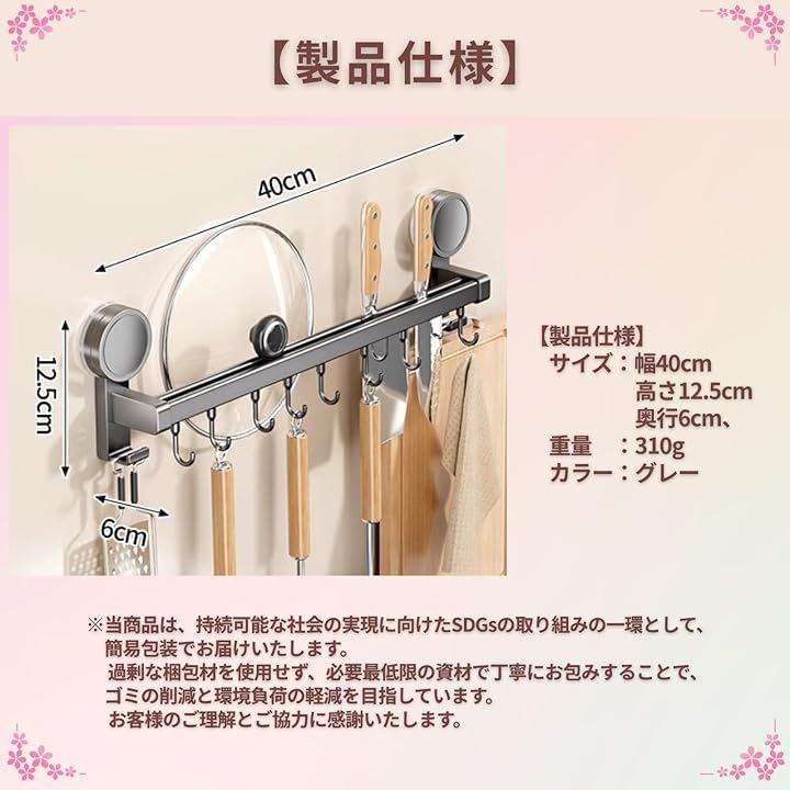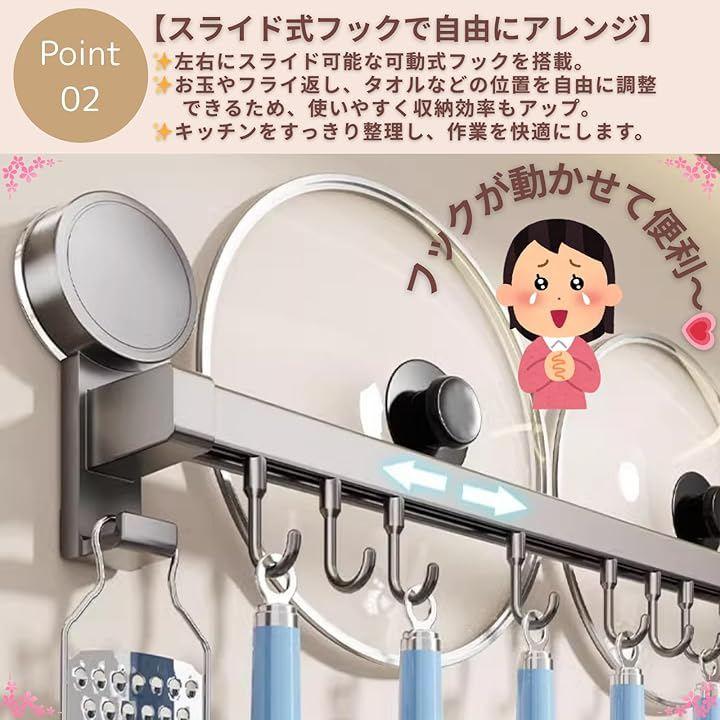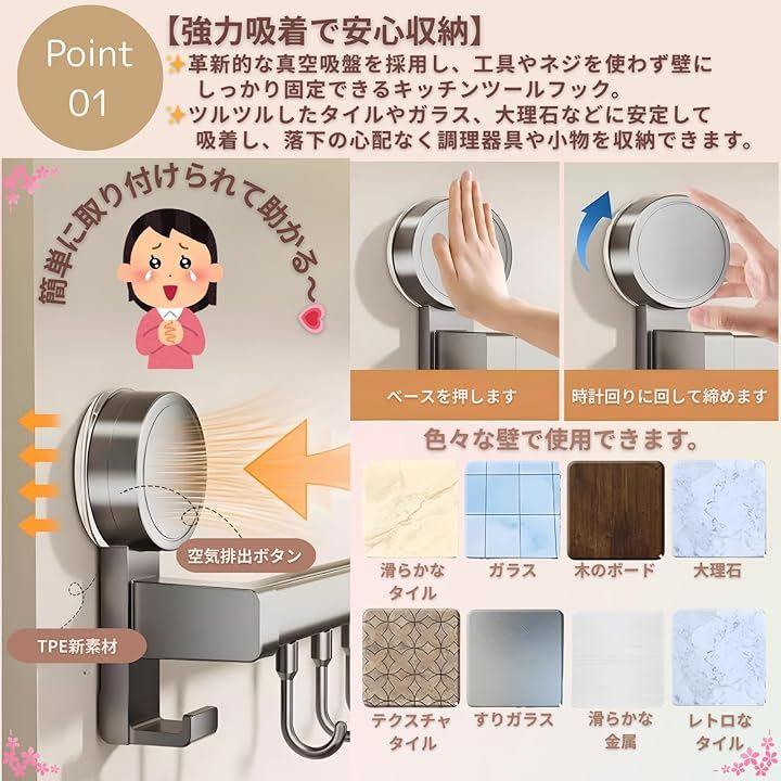 「強力吸着で安心収納」革新的な真空吸盤を採用し、工具やネジを使わず壁にしっかり固定できるキッチンツールフック。