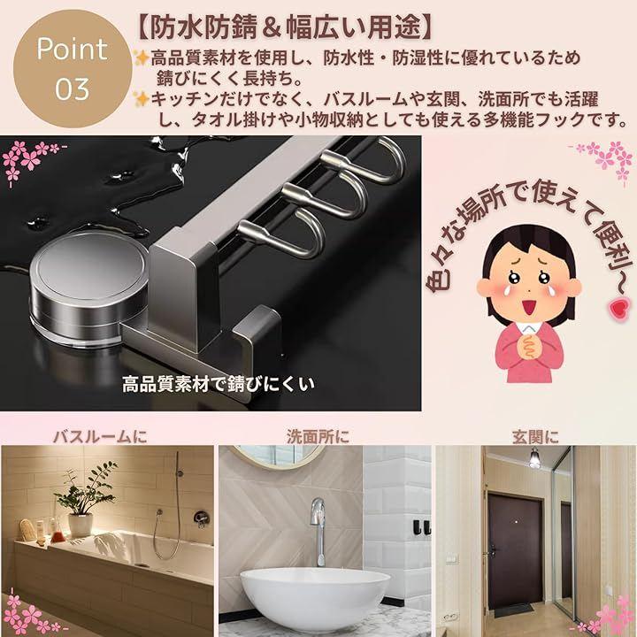 キッチンだけでなく、バスルームや玄関、洗面所でも活躍し、タオル掛けや小物収納としても使える多機能フックです。