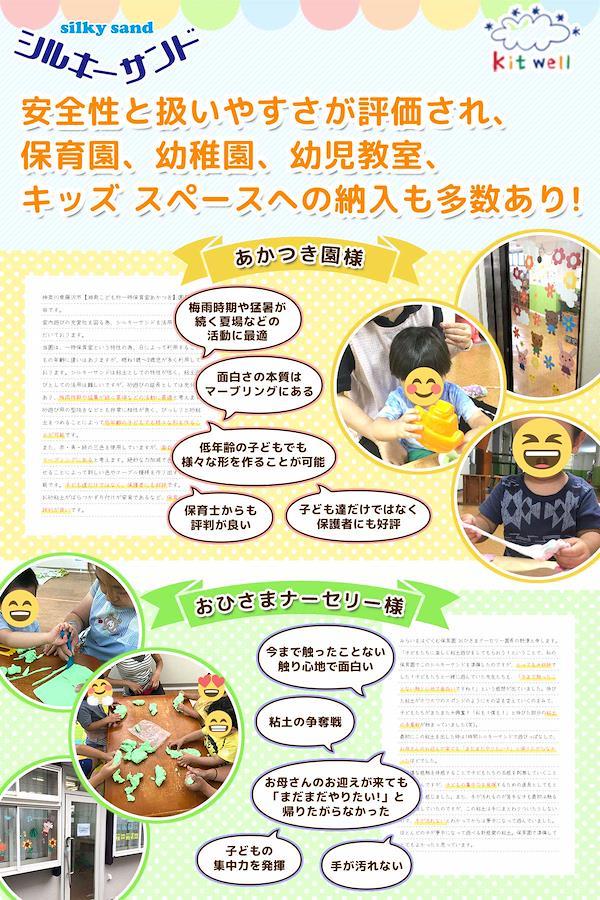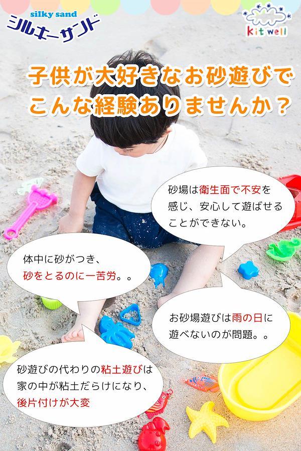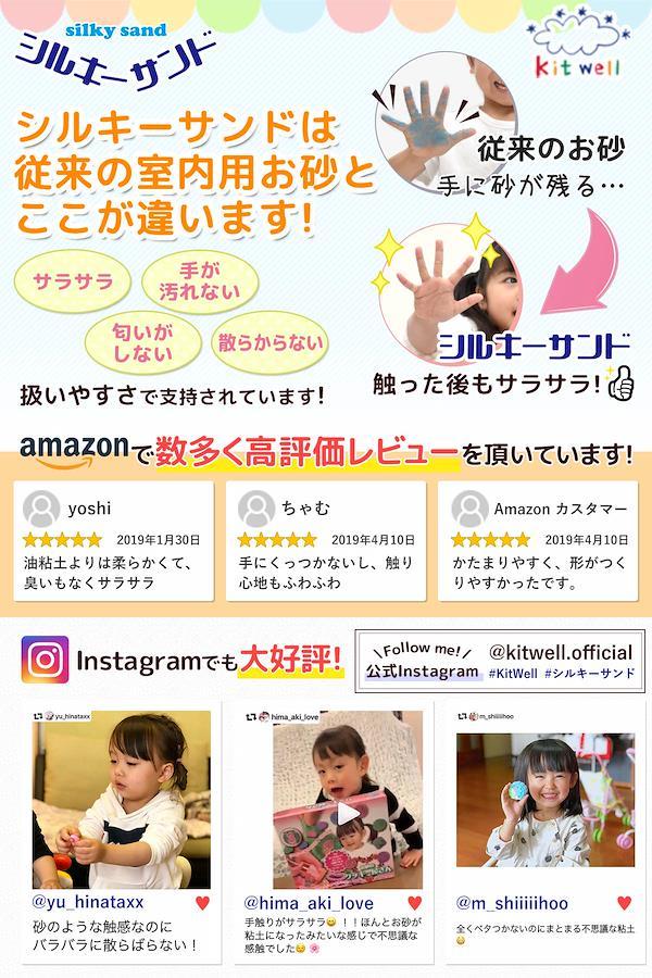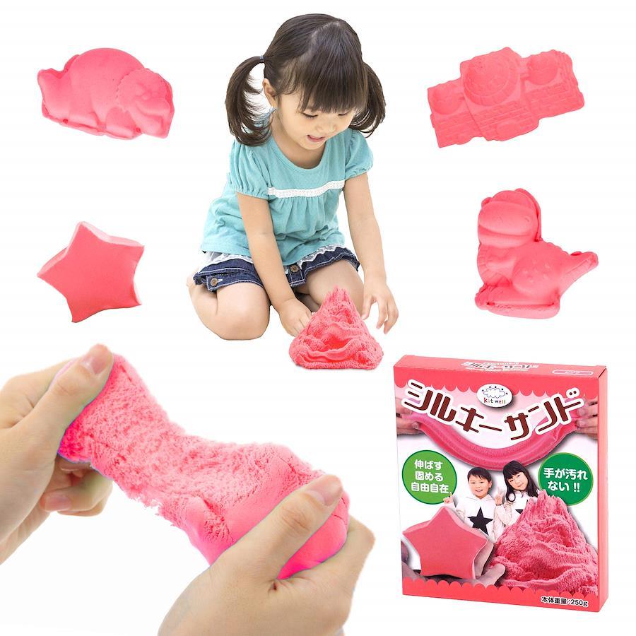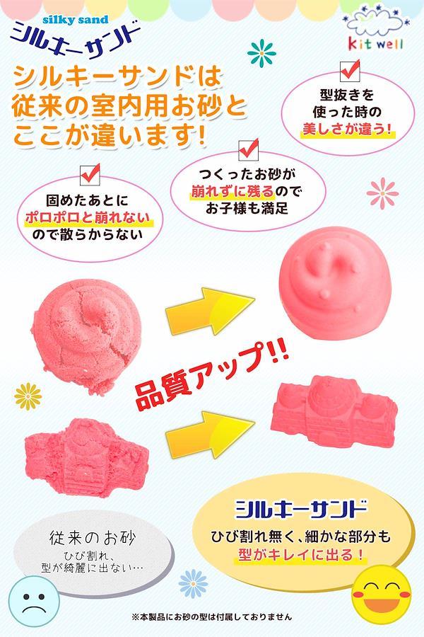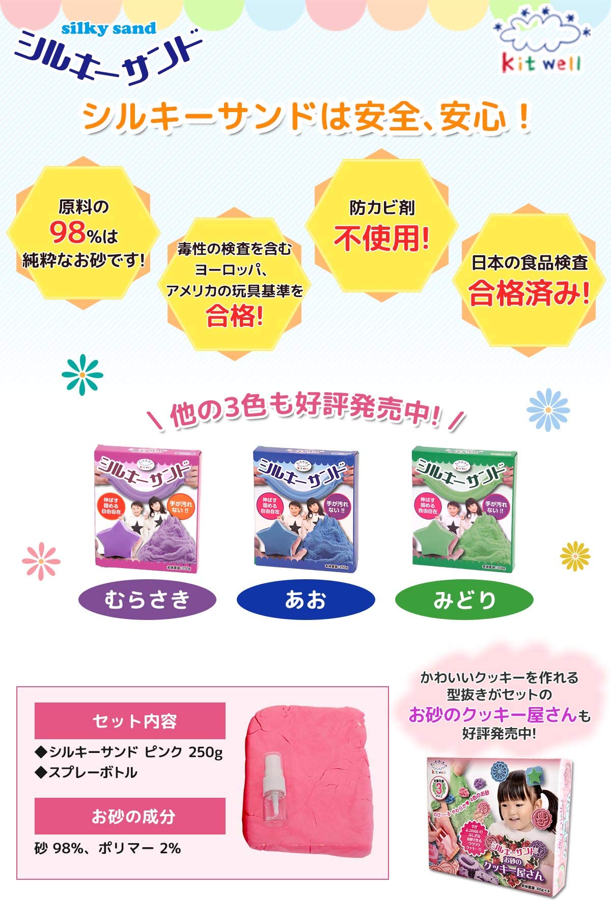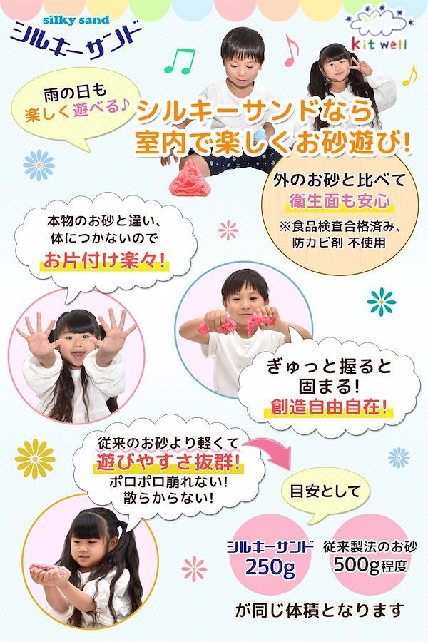 シルキーサンド 250gは従来の製品より軽くギュッと固まりやすい特殊製法で作られた最高品質のお砂です。他製品のように床にジャリジャリが残りません!手で運んでも型崩れせず楽しく遊べる室内用のお砂です カラフルでギュッと固まるお砂で想像力を鍛えよう!創造しよう!DIY感覚で作った不思議なお砂は崩れにくく、女の子のおままごとにも最適!粘土の様にキネティックな作品も作れるサンドです!室内遊びの必需品! 原料の98%は純粋なお砂で作られており毒性の検査を含むヨーロッパ、アメリカの玩具基準を合格しており安心してお遊び頂けます。日本の食品衛生法検査にも合格済みで安全!室内にお砂場を作ろう! 安全性が評価され、人気ランキング急上昇!保育園、幼稚園、幼児教室、キッズ スペースへの納入も多数あり、お誕生日、入園祝い、入学祝い、クリスマスなどの プレゼント、ギフト、贈り物に選ばれています! 特殊な加工により砂同士でしか固まらず、ポロポロしない為、片づけ楽チン♪力を入れるとキュッと固まる砂で、粘土の様にしっとりした感触が楽しめます。雨の日もこの室内用のお砂遊びで大満足!