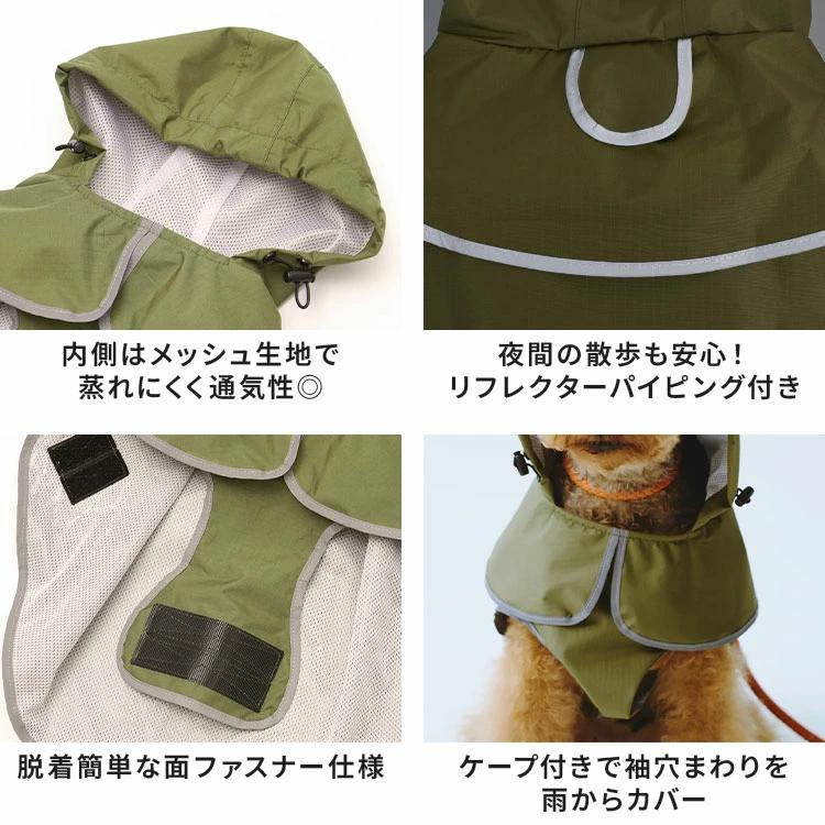 豪雨にも耐える、耐水圧10,000mmH2Oの防水生地を採用。さらに表には撥水加工が施されているので、雨の日でも快適に着用できます。面ファスナーによる簡単着脱仕様で、わんちゃんにも負担が少なくスムーズに着せることができます。頭まわりを調節できるドローコードや、後頭部にはフードを固定する面ファスナー、尻尾固定用のゴム付きでフィット感にもこだわりました。夜間のお散歩でも安心なリフレクターパイピングを採用。リードを付けたまま着用できる仕様で、安全性にも配慮されています。