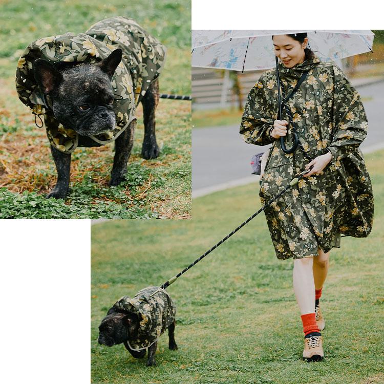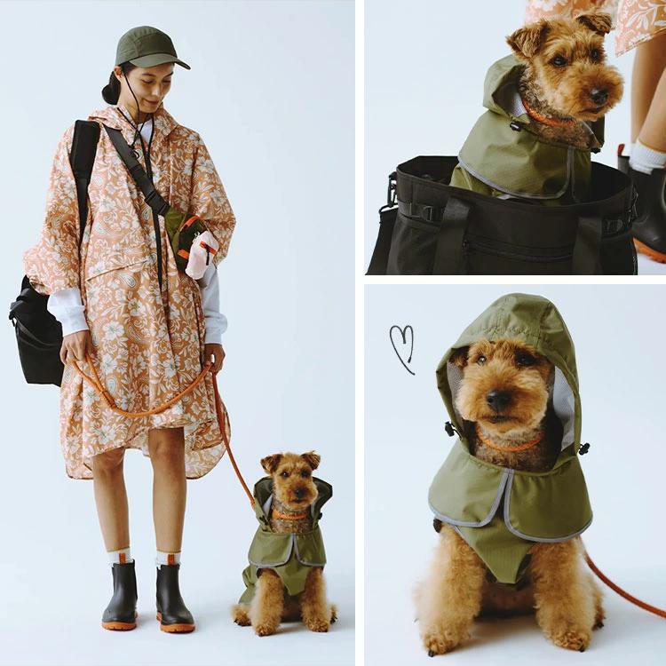 【キウ ドッグレインポンチョ】KiU初の犬用レインポンチョが登場!従来のレインポンチョと同じ柄を使用しているため、飼い主さんとペットでお揃いコーデを楽しみながら、雨の日のお散歩も快適に過ごせます。
