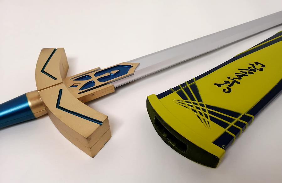実物写真 (刀掛台別売り)、 剣全長約104cm、収納時110㎝。 剣重さ約330g、鞘込みで約630g 刀素材: ウレタン樹脂 (皮革のように柔らかくて軽量。 金属/木製ではありません。) 内部に芯があり、ガラス繊維で強化されている。 簡単に折れません。 鞘はPVC製です。 簡易ビニール包装です。 職人の手作り商品ですので、商品細部の品質に関して、実物の拡大写真で、ご精査・ご判断お願い致します。 商願(2016-131280)を使用する商品です。 他店舗の出品は商標法違反となります。