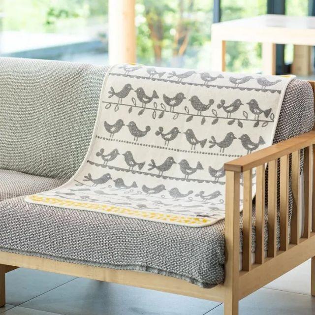 小枝に泊まる小鳥たちを向かい合わせで仲良く配置したロッタ・グラーベによるデザイン。白抜きで描かれた鳥のシルエットは、スウェーデンの国鳥「クロウタドリ」を思い起こさせます。春の訪れを感じさせる鳥としても知られているように、インテリアに明るく爽やかな空気をもたらしてくれるデザインです。