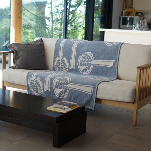 新作カラーは、空や海を連想させるやさしい「ブルー」。強すぎない穏やかなカラーリングが、お部屋全体を明るく、リラックスした雰囲気に一新します。子供から大人まで性別を問わず、どなたにも使いやすい一枚。春夏秋冬、どの季節にもあうので、暮らしになじむ大切なブランケットとしてずっとそばに置いてお使いいただけます。
