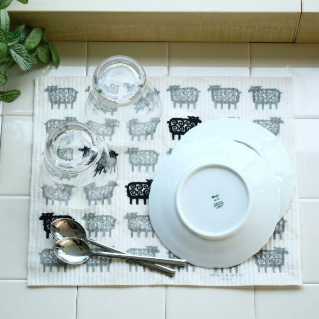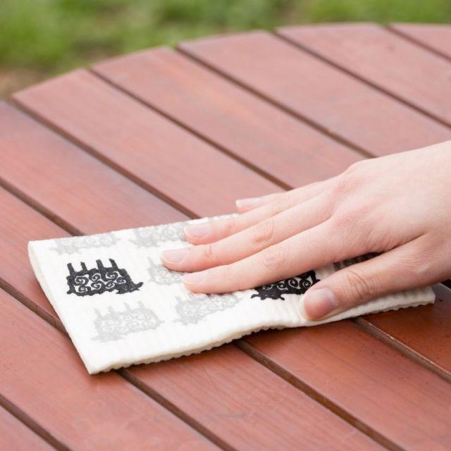 1949年にスウェーデン人によって開発されたスポンジワイプ。今や、スウェーデンで使わない家はないというほどの定番中の定番ふきんです。乾いているときは、紙のようにパリッっとしていますが、濡らすと弾力のある柔らかふきんに。使う前は水に濡らして、ねじらずに軽く片手でキュッと握って水を切るのがポイント。こぼれた水分、液体はサッとひと拭き。自重の10倍以上の水をあっという間に吸い取ります。水あと、ケバも残しません。ふきん、水切りマットとしてはもちろん、洗面所、お風呂、窓の結露などの拭き上げとして水にまつわる場所で大活躍します。