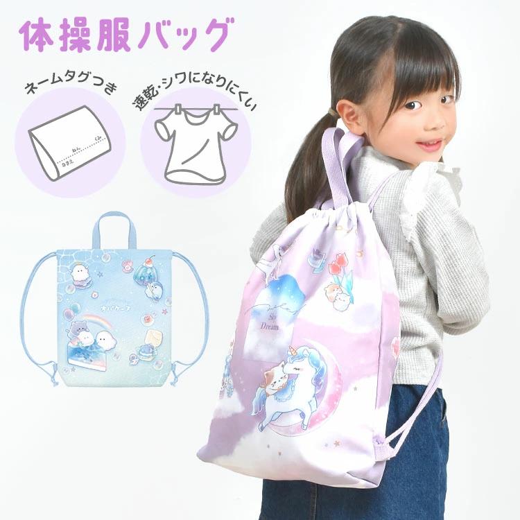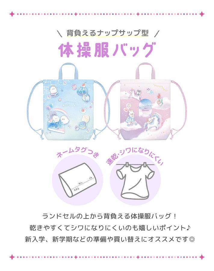 【体操服バッグ】ランドセルの上から背負えるナップサック型のバッグ。乾きやすくてシワになりにくいのも嬉しいポイント◎内側にネームラベルがついているので紛失防止になります。8cmのマチなので体操服だけでなく教科書やノートもしっかり収納できます。人気のオバケーヌ柄やユニコーンと子供が嬉しいバリエーション♪新入学、新学期などの準備や買い替えにおすすめです◎
