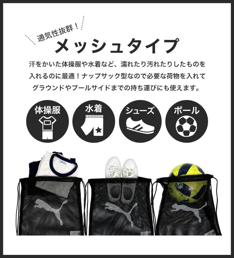 【メッシュ ジムサック】人気のスポーツブランド『PUMA』から、メッシュ製のジムサックが登場。通気性抜群のメッシュタイプで、汗をかいた体操服や水着など、濡れたり汚れたりしたものを入れるのに最適です◎ナップサック型なので、部活・通学にはもちろん、スポーツシーンでのグラウンドやプールサイドなどへの持ち運びにも便利です♪