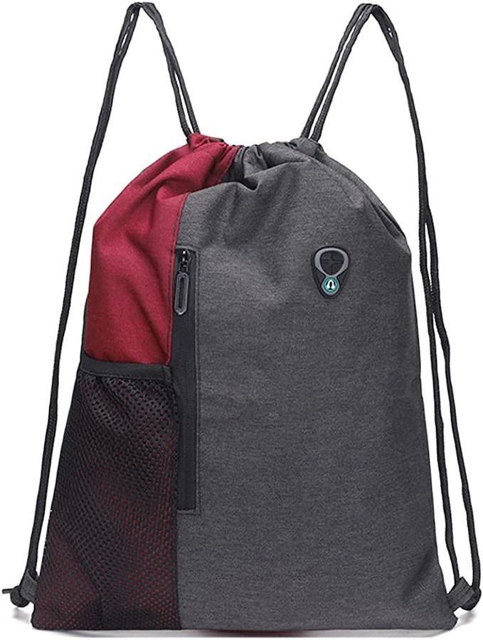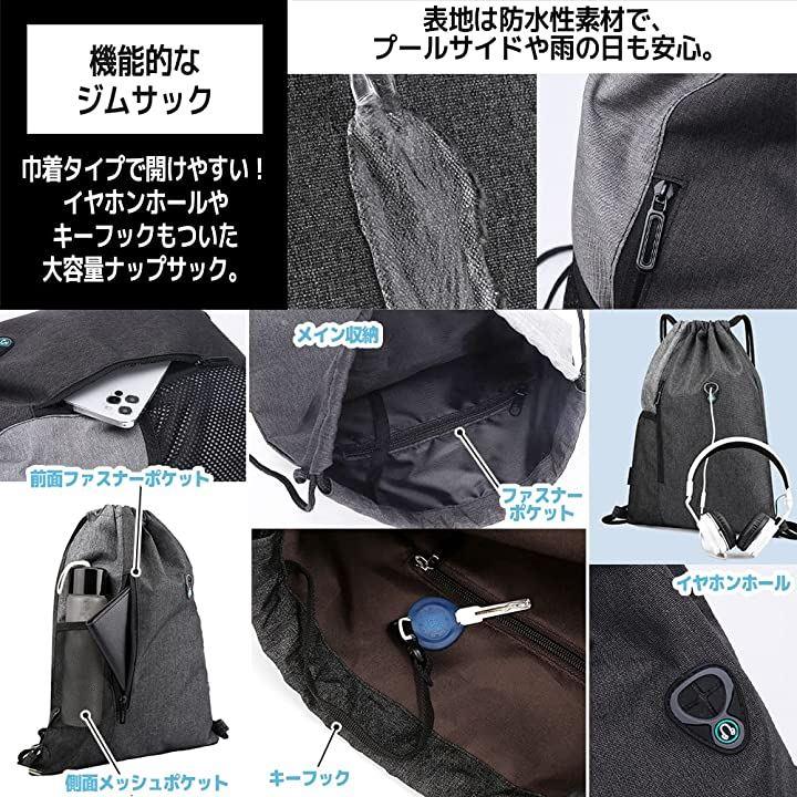 シンプルな無地の巾着タイプで、イヤホンホールやキーフックもついた機能的なジムサックです。