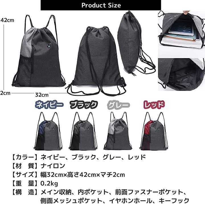 「材質」ナイロン「サイズ」幅32cmx高さ42cmxマチ2cm「重量」0.2kg「構造」メイン収納、内ポケット、前面ファスナーポケット、側面メッシュポケット、イヤホンホール、キーフック