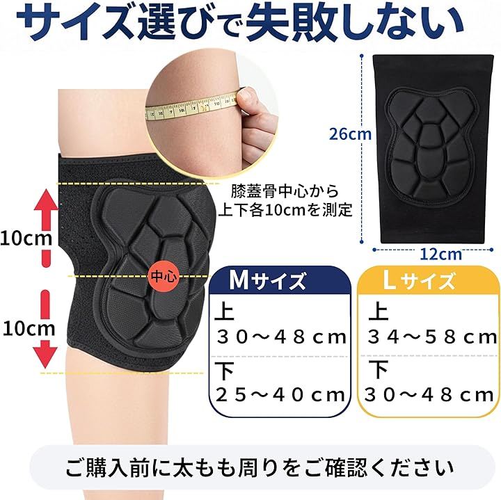 「サイズの選び方(M/L)」 膝中心から上下各10cmで周囲を計測。