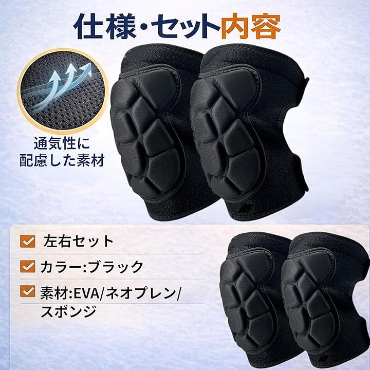 「仕様」 タイプ:巻き付け式(面ファスナー)ニーパッド/左右セット カラー:ブラック サイズ:M/L M:上周 30–48cm/下周 25–40cm(測定位置=膝蓋骨中心から上下各10cm) L:上周 34–58cm/下周 30–48cm(同上) 製品サイズ:26x12x2cm(1枚あたり) 素材:ネオプレン(クロロプレンゴム)、スポンジ 機能:立体3Dクッション/強力面ファスナー/滑り止め/通気/洗濯可 用途:床掃除/園芸/DIY/引っ越し/内装など膝をつく作業 内容物:本体x2(左右セット)