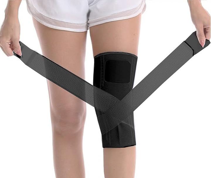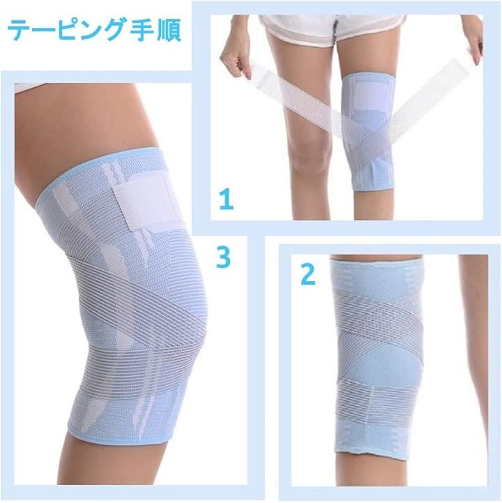 Knee support taping for sports, elderly, and cold weather protection. Highly breathable mesh tape. One piece for left or right knee. Includes training instructions.
