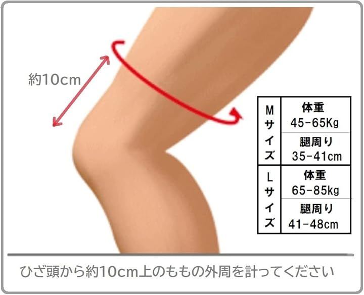 サイズ選びは、M:体重45~65Kg L:体重65~85Kg 腿周り参考:膝上10cmの太ももの外周を測ってください。