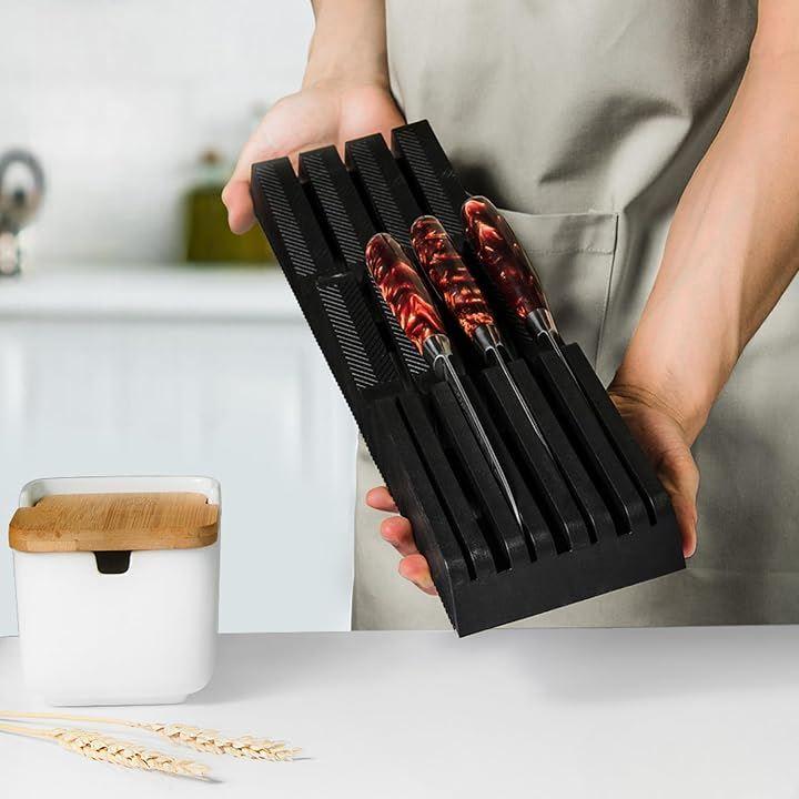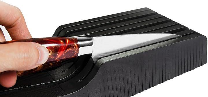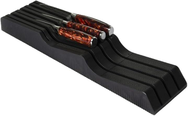 素材:プラスチック 寸法:長さ43cm x 幅10.5cm x 高さ4.8cm 収納可能本数:長い包丁3本、短い包丁4本(計7本) 付属品:滑り止め食器棚シート(30cm x 150cm) 特徴:丸洗い可能、平置きタイプ、滑り止め付き カラー:ブラック(黒)