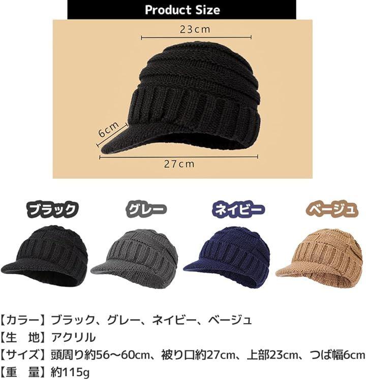 「カラー」ブラック、グレー、ネイビー、ベージュ「生地」アクリル「サイズ」頭周り約56~60cm、被り口約27cm、上部23cm、つば幅6cm「重量」約115g