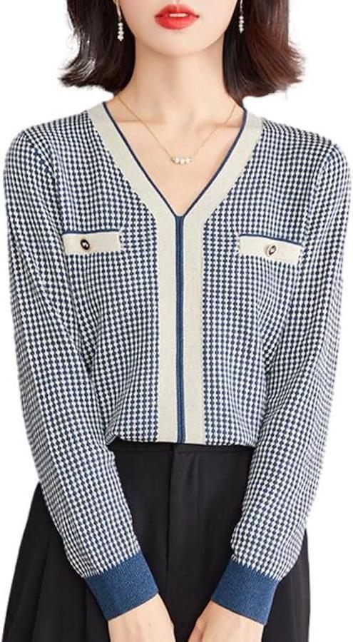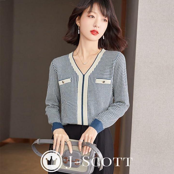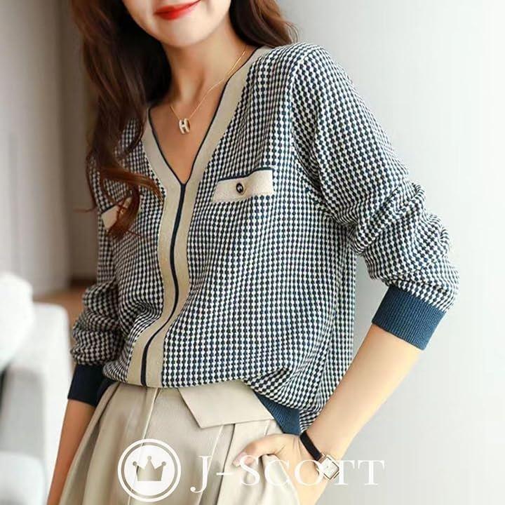 クラシックで上品なVネックのチェック模様ニットに、胸元のゴールドがアクセントになって。