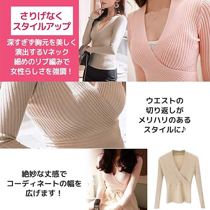 [FUPUTWO]ニットセーターレディースVネックトップス胸元セクシー長袖リブカシュクールボディコンタイト
