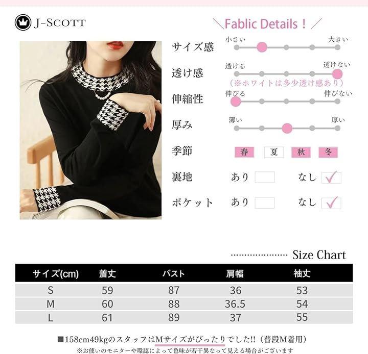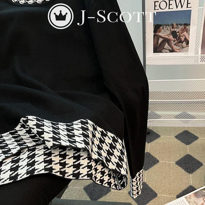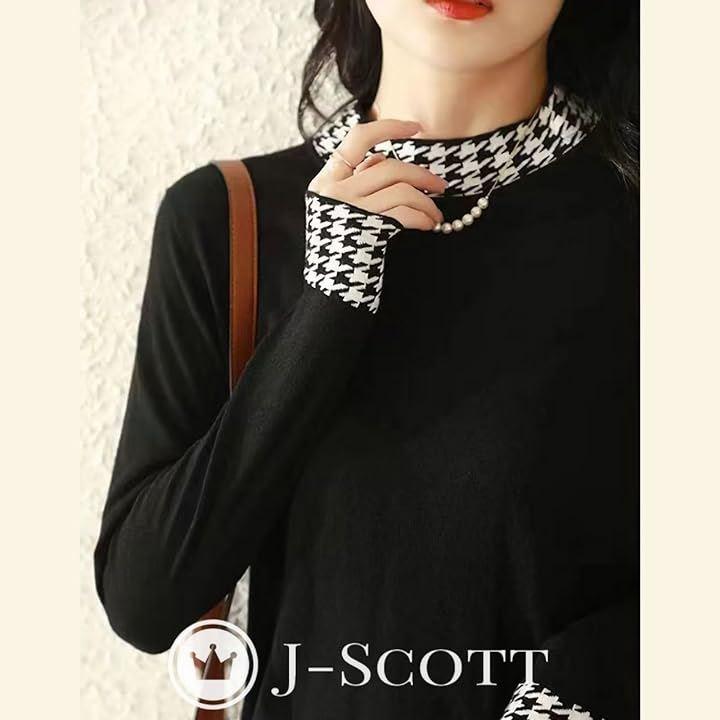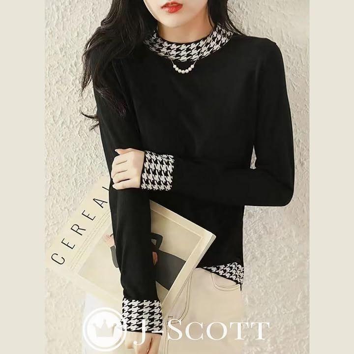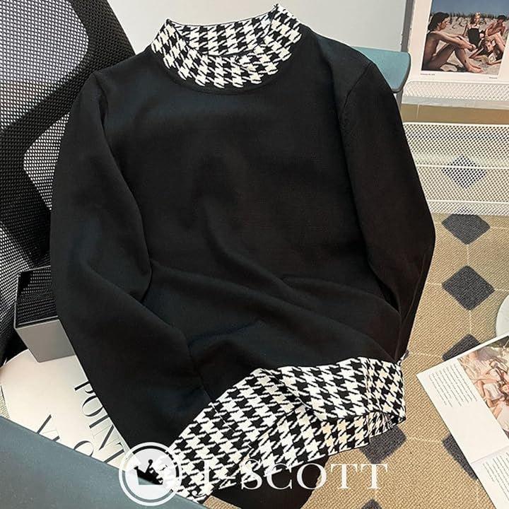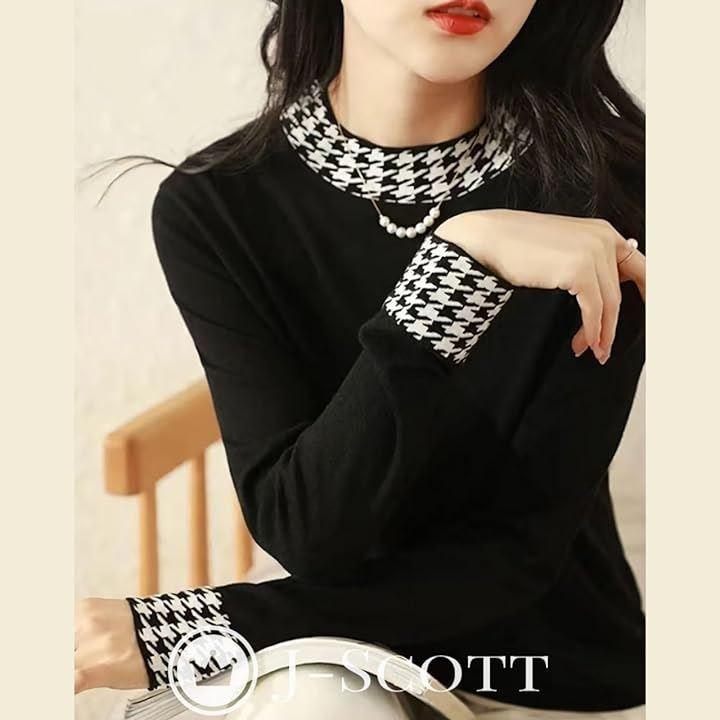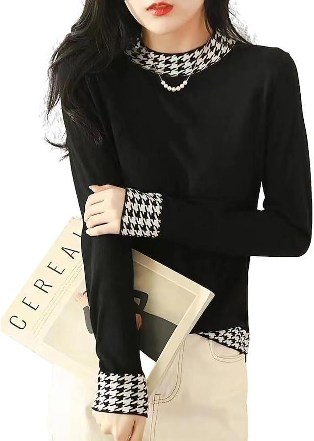 黒と白の千鳥柄のコントラストがアクセントになり、クラシカルで洗練された印象のニットトップス。