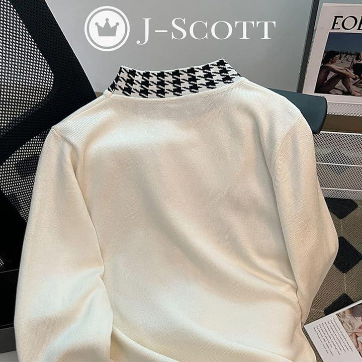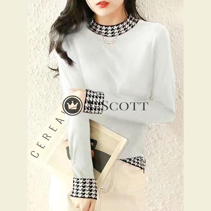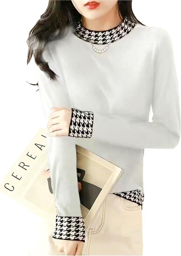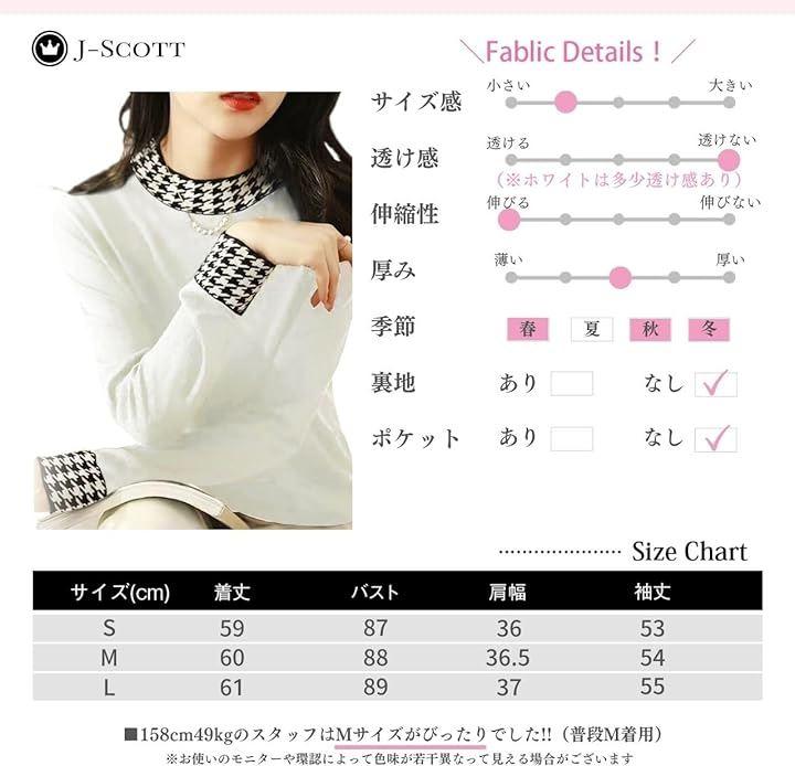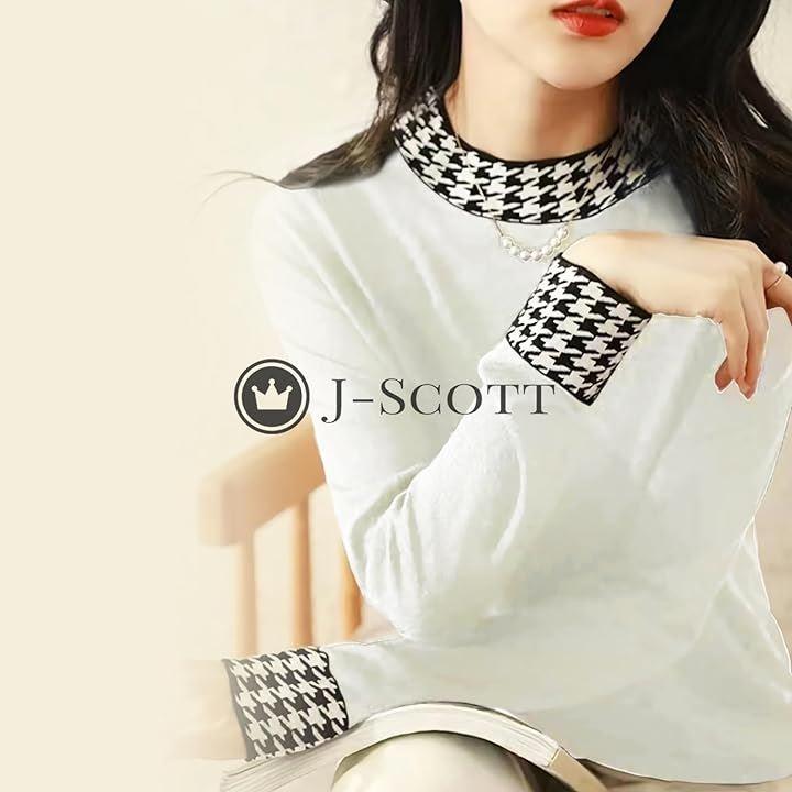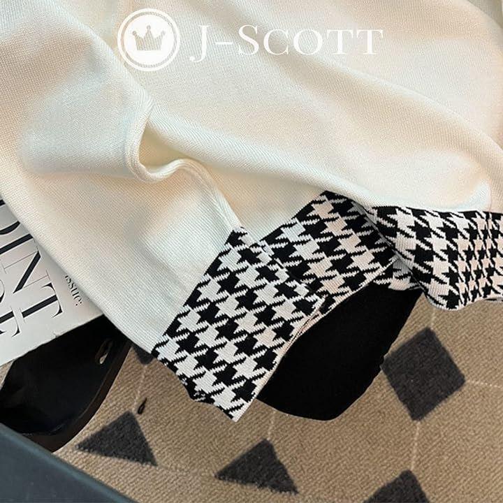 黒と白の千鳥柄のコントラストがアクセントになり、クラシカルで洗練された印象のニットトップス。