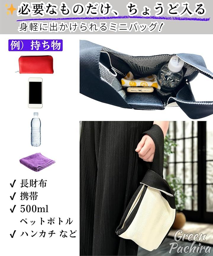 近所のお買い物、お散歩、ランチ、社内移動など、荷物をまとめたいシーンにぴったりのミニバッグです。