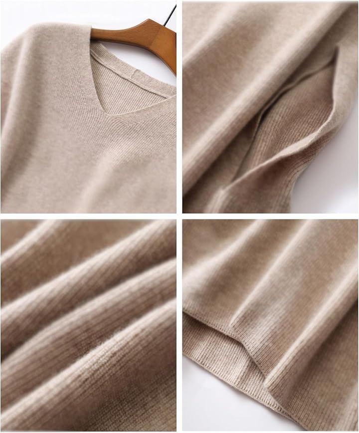 特にネック部分は深めのVネックとなっており、デコルテラインもキレイに見えるのと首もスマートに見せてくれます。