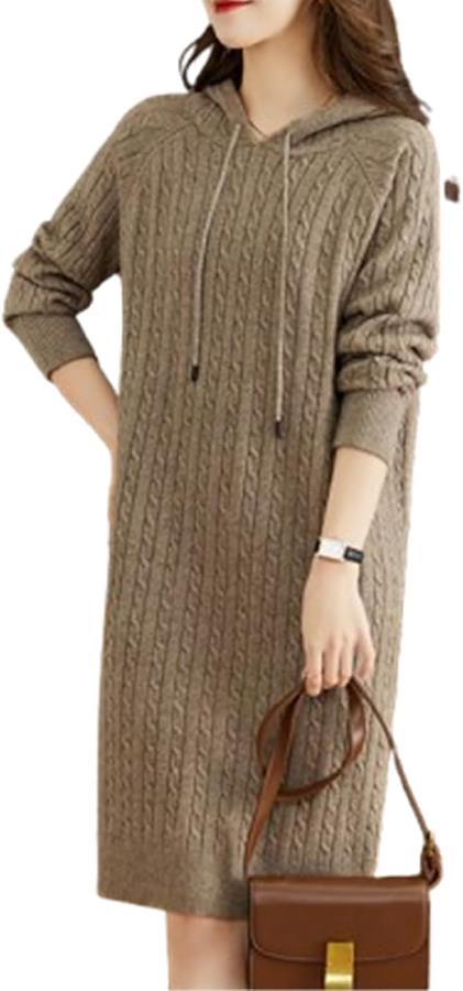 すっぽり被れるフード付きは紐付きで しっかりとした編地できれいめな大人女子な印象は、カジュアルにも、上着の重ね着でこなれ感でビジネスカジュアルでも、ロングシーズン活躍するミディ丈ワンピースです