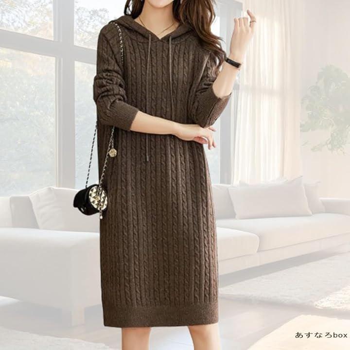 すっぽり被れるフード付きは紐付きで しっかりとした編地できれいめな大人女子な印象は、カジュアルにも、上着の重ね着でこなれ感でビジネスカジュアルでも、ロングシーズン活躍するミディ丈ワンピースです