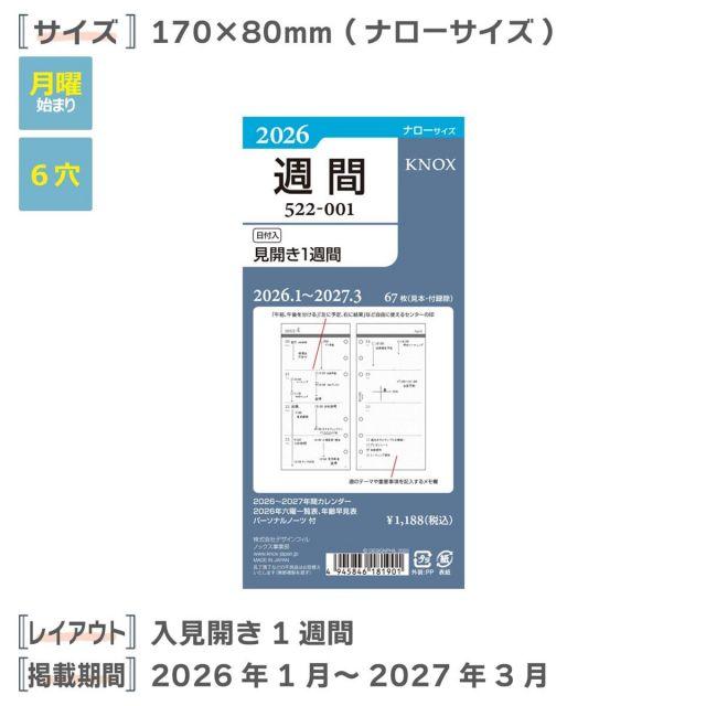 スタイル:見開き1週間◆商品名:ノックスシステム手帳リフィル2026年ナローウィークリー見開き1週間52200126(2026年1月始まり)