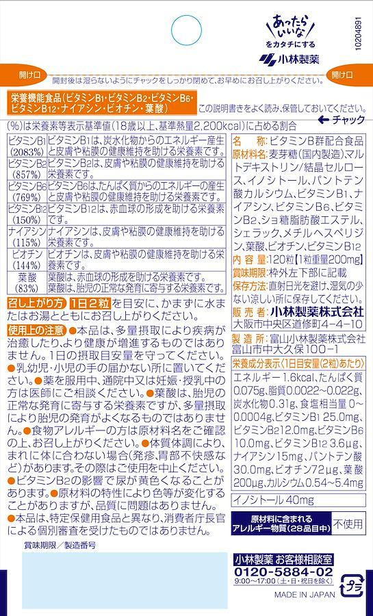 直射日光を避け、湿気の少ない涼しい所に保存してください。 内容量:24g(200mg*120粒) 1日量(目安):2粒 サイズ:高140*幅120(mm) ビタミンB1・ビタミンB2・ビタミンB6・ビタミンB12・ナイアシン・パントテン酸・ビオチン・葉酸の栄養機能食品です。 約60日分 ■重要なお知らせ