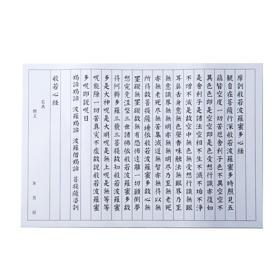土佐和紙を採用した高級写経用紙、写経用に独自に開発された土佐和紙を採用しています。 見本が同梱されているので、そちらを見て書いてもいいですし、和紙の下に置いてなぞっていただいてもかまいません。般若心経は初心者でも書きやすい楷書体で印刷されていますのでどなたでもお気軽に写経を始める事が可能となっています。 シンプルに印刷は一切ない無地の土佐和紙になります。