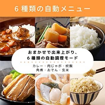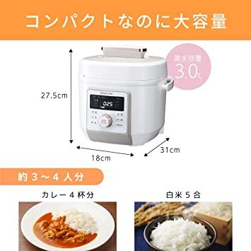 ●はじめての圧力鍋でもマイコン&5段階圧力で「簡単・時短」本格煮込み●煮込み料理から時短ごはん、スイーツまで●満水容量3.0L、コンパクトでも大容量●6つの自動メニュー搭載:角煮、肉じゃが、おでん、炊飯、玄米、カレー●外出先でも便利なタイマー予約機能(最大19.5時間)●調理後の保温タイマー付き(最大12時間)●圧力無しの煮込みモード搭載●安心機能:蓋の締め忘れ:ブザー音、なべ無し時:自