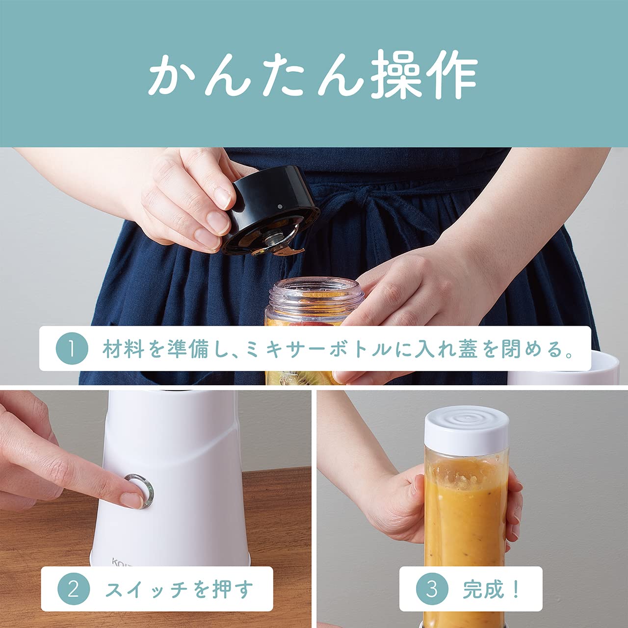 3営業日以内に発送≪新品未開封品≫:サイズ:幅8.5×奥行8.5×高さ29cm本体重量:600g電源:充電式(専用USBケーブル使用)容量:ミキサーボトル280ml場所を選ばず使用できるコードレスミキサー