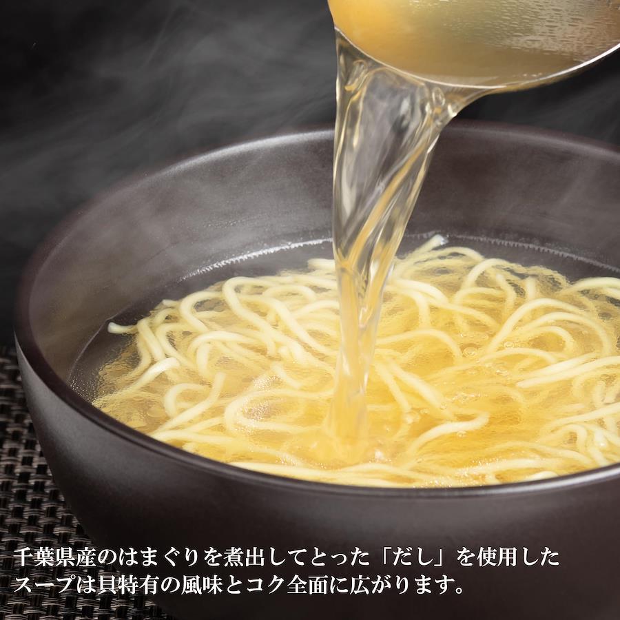 国産素材の「だし」のうまみが効いたラーメン「だし麺」。おいしさはそのままにデザインを替え、生まれ変わりました。千葉県産のはまぐりを煮出してとった「だし」を使用したスープは貝特有の風味とコク全面に広がります。麺は、生麺を約2日じっくりと時間をかけて熟成と乾燥させたコシのある生麺食感です。【ゆで時間・4分半】